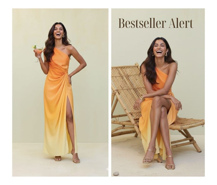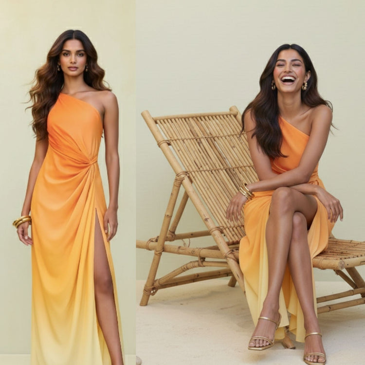 Introducing "Waves by Shrijal". Waves by Shrijal: Blush Crush tells the story of the simple flower by the Awas beach, the ombre shades of the monokini & flowers in the sarong that gives you a feeling of a beautiful sunset. This orange ombre one-piece...