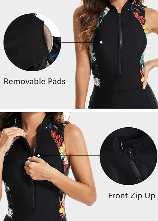 Turn heads at the beach or poolside with this floral-panel zip-front swim romper! Designed for active women who love to move, this sleeveless swimsuit features a flattering high neckline with a smooth front zip for easy wear. The vibrant tropical print side panels add a pop of color while contouring your silhouette beautifully.