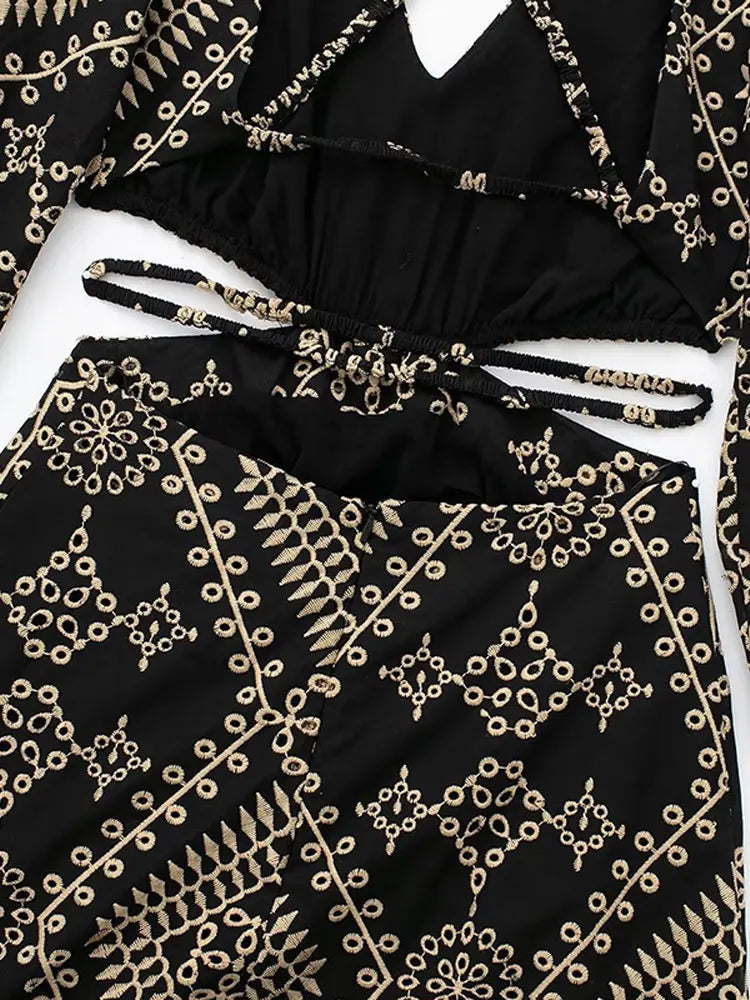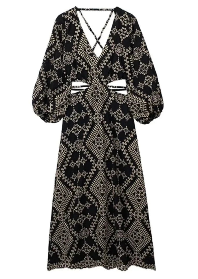 Unleash your bohemian spirit with the WomanLikeU Black Boho Full-length Dress – a fusion of elegance and free-spirited charm. This printed dress showcases enchanting bishop sleeves and an ethereal material that gracefully flows with every step. The dress is designed with alluring waist cutouts, adding a touch of flirtatious allure, while the strappy-styled back elevates the Boho vibe.