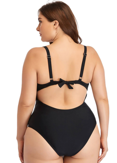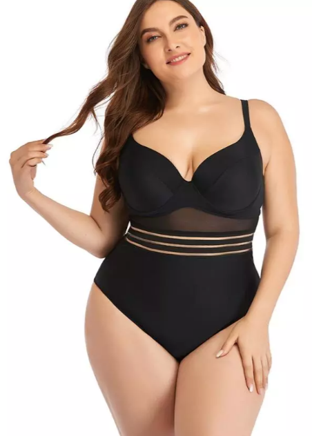 The flattering black one-piece designed to celebrate every curve. Featuring molded underwire cups for enhanced support and lift, this swimsuit offers a confident fit for fuller busts. The sheer mesh waist panel with stylish stripe detailing adds a touch of allure while visually slimming your midsection for a sleek silhouette.