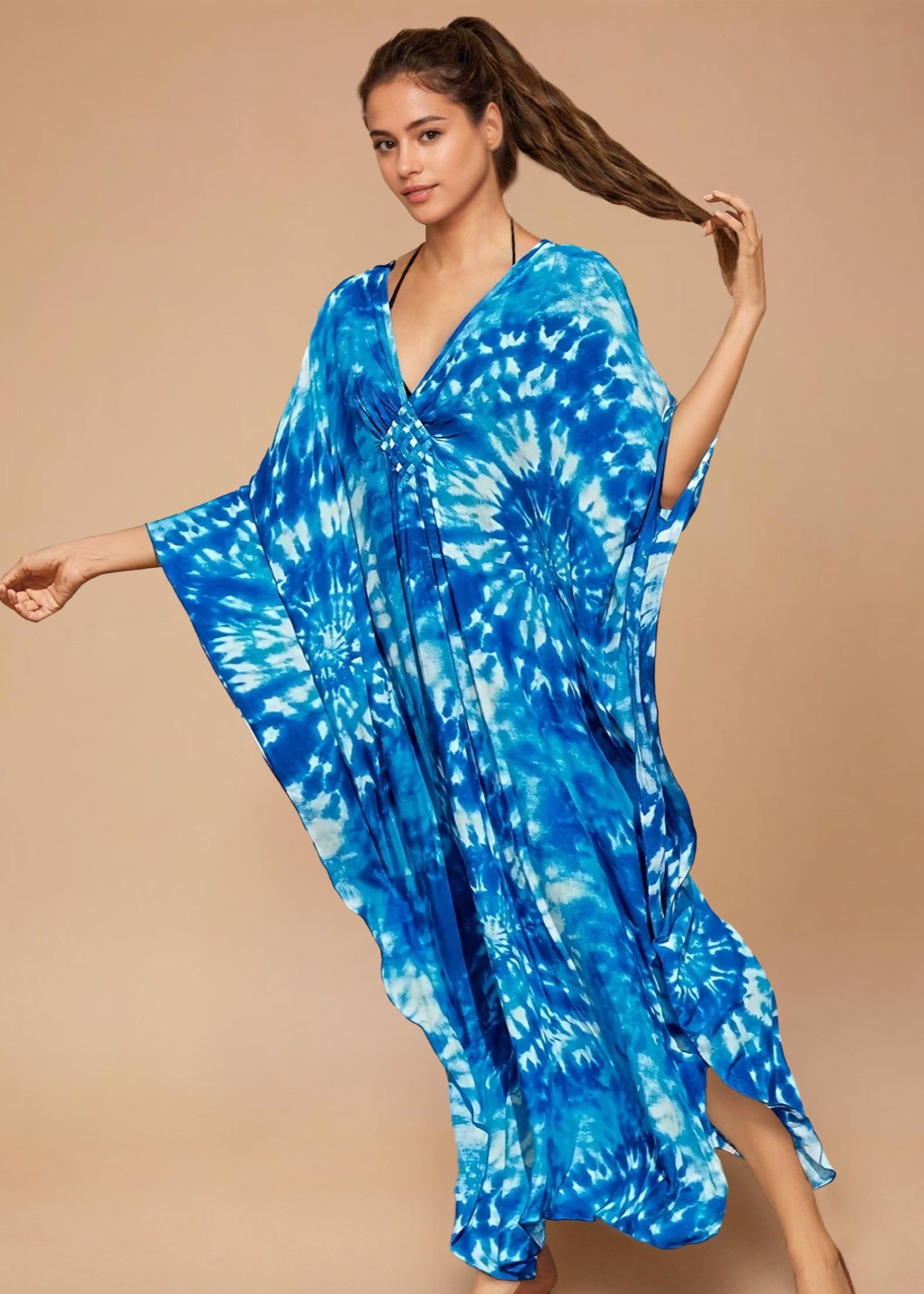 Make a splash in effortless resort style with our Blue Kaftan Dress. Crafted in a breezy, flowy silhouette, this kaftan features an eye-catching ocean-inspired tie-dye print that’s perfect for beachside lounging or poolside glamour. The deep V-neckline, subtle pleats, and beaded front detailing add a touch of elegance, while the lightweight fabric keeps you cool and comfortable. Ideal to throw over your swimsuit, it gives just the right amount of coverage with a relaxed, flattering fit.