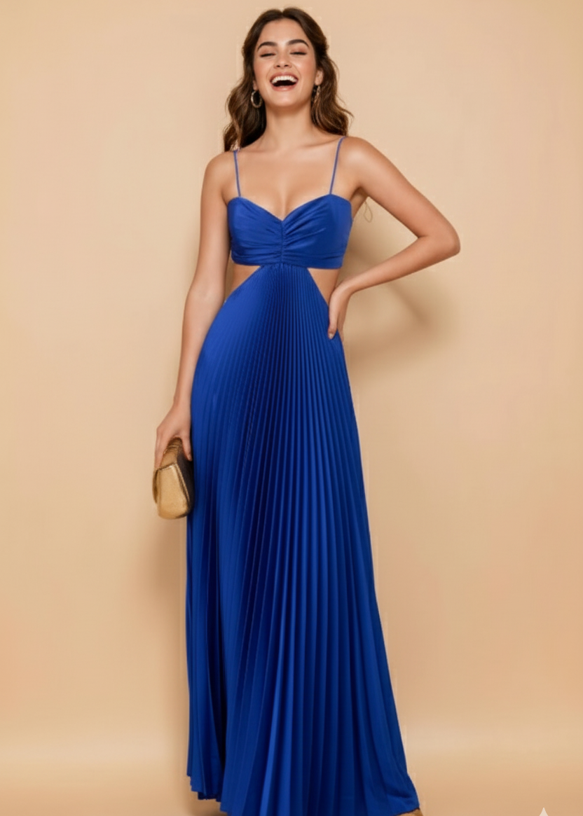 Make a bold statement in this stunning Blue Padded Maxi Dress. Featuring a ruched bodice with delicate spaghetti straps, Designed with a fitted, padded bust for added support and shape and a chic cut-out detail at the waist. The cut-out detailing adds a contemporary touch, making it perfect for evening events or glamorous occasions. The floor-length pleated skirt flows gracefully with every step, giving a regal charm to your look.