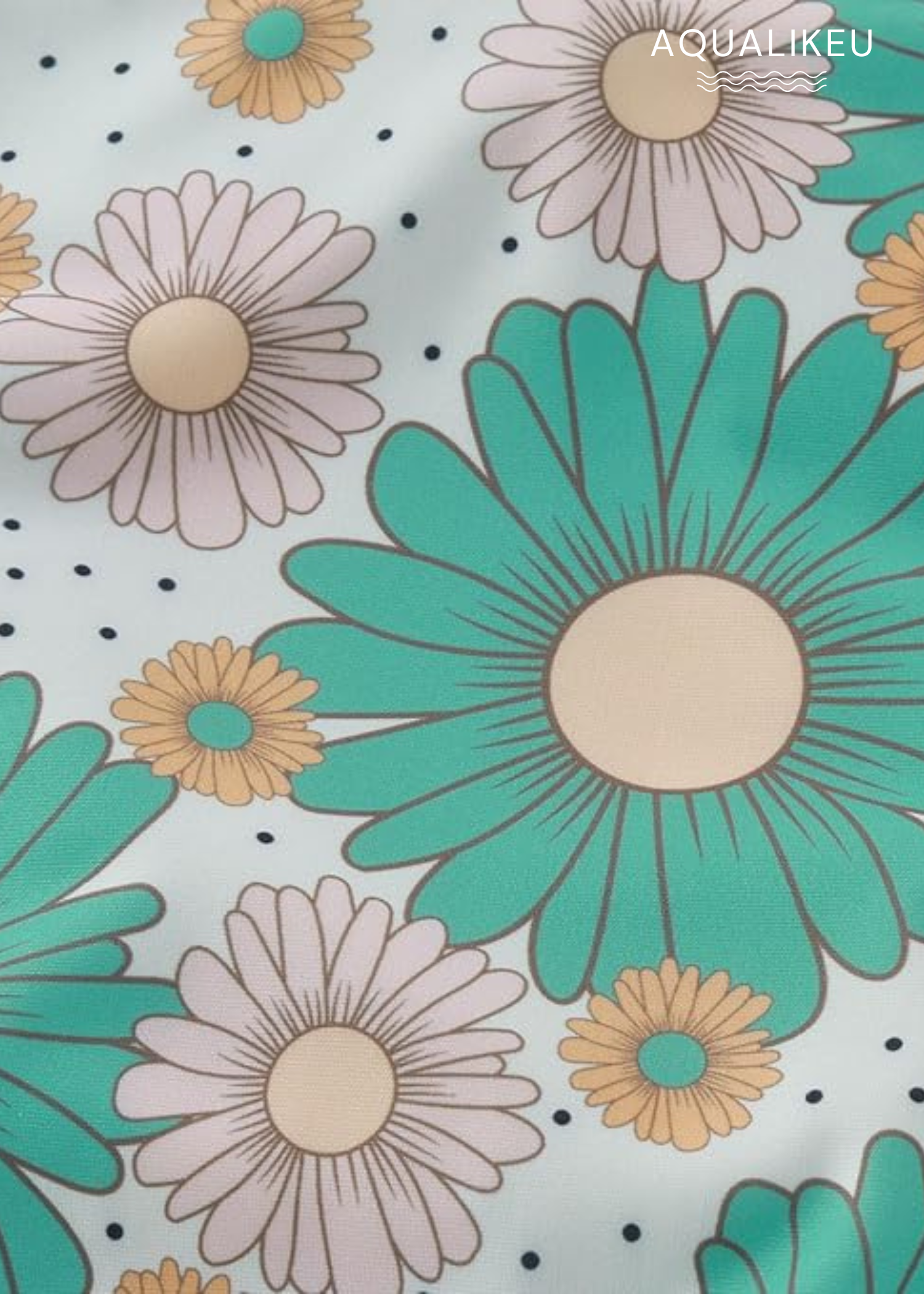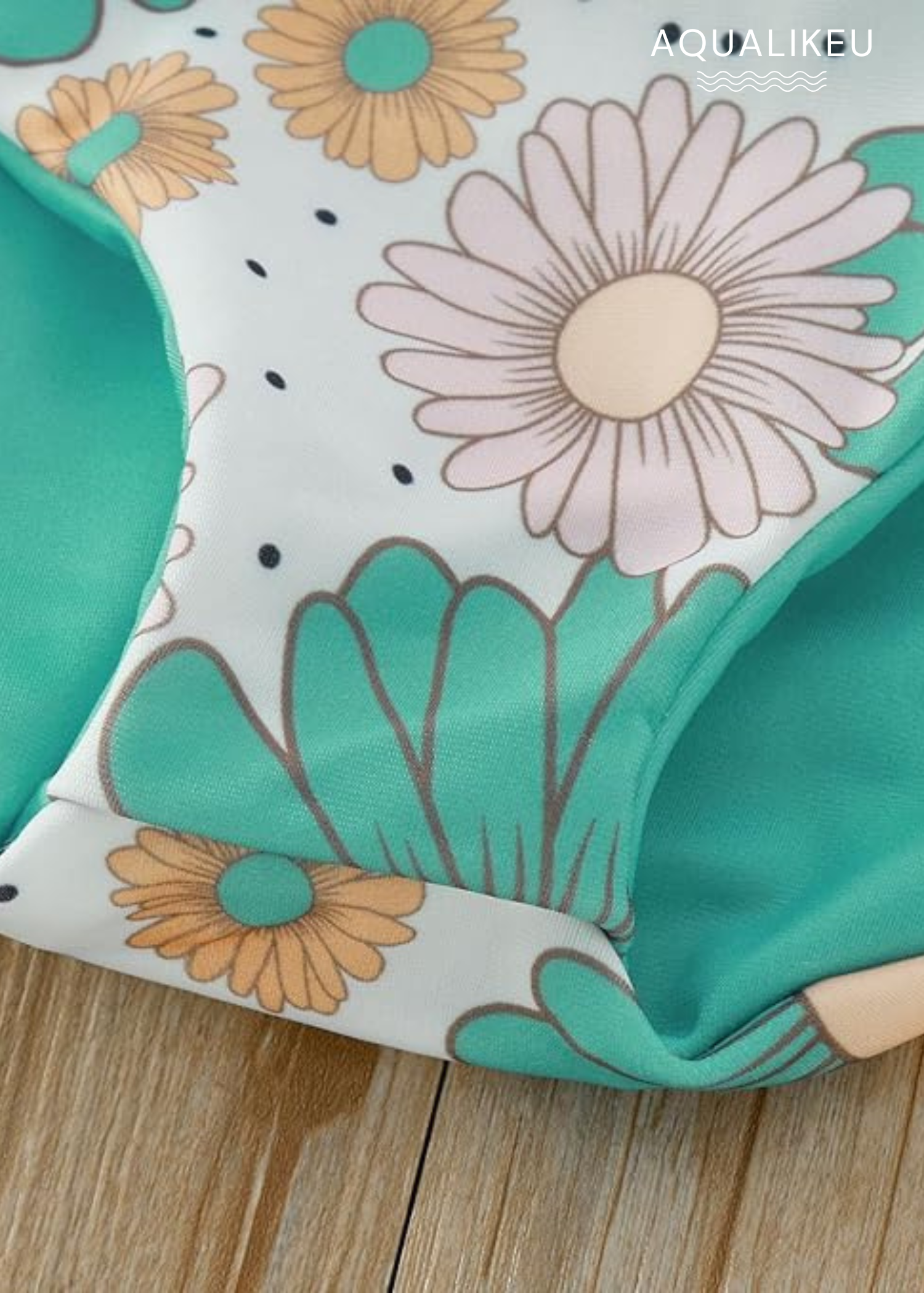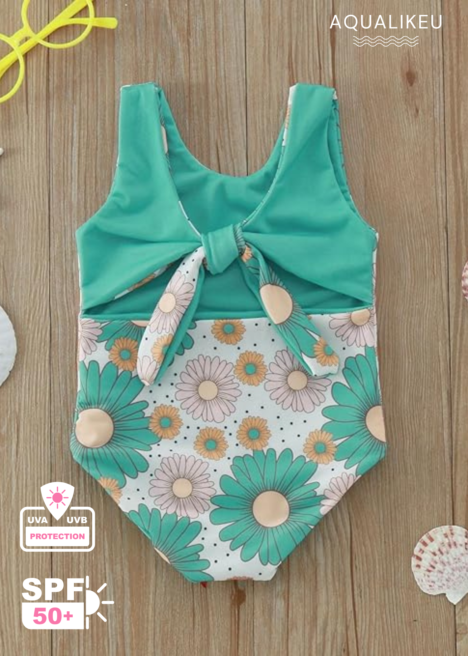 Bursting with charm and color, the swimsuit is a one-piece stunner designed for playful summer adventures. Featuring a vibrant teal top with a knotted bow and a daisy print bottom.
