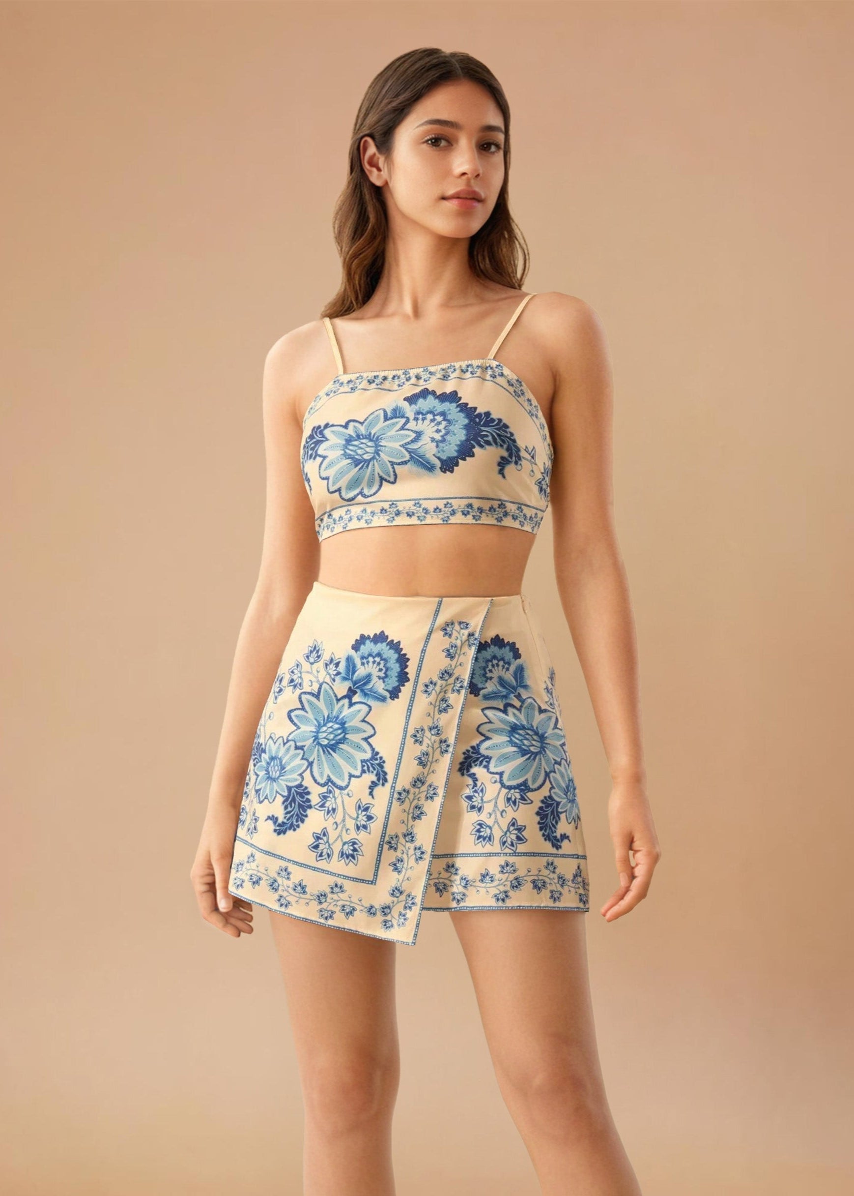 Step into summer with effortless elegance in our Off White & Blue Floral Co-Ord Set. Featuring a cropped cami top with adjustable straps and a tie-up back, it offers both a flattering silhouette and a customizable fit. Paired with high-waisted wrap-style shorts, this look is finished with bold blue floral prints that bring effortless elegance to any day out.