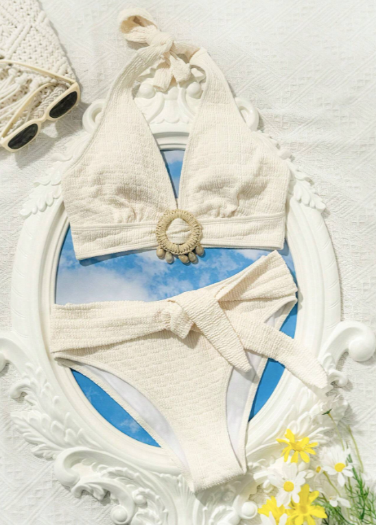 The Off-White Textured Bikini Set in Ivory Dream blends beachside elegance with cozy comfort, crafted from soft, stretch knit fabric that hugs your body just right. The halter top features a flattering plunge neckline with a handcrafted shell-accented ring for a touch of island glam, while the mid-rise bottoms include an adjustable tie-front detail that flatters your curves and ensures a perfect fit. Designed for lounging poolside, strolling the shore, or soaking in the sun, this set brings effortless vacation energy to any setting. Hand wash cold and lay flat to dry to keep it looking fresh all summer long.