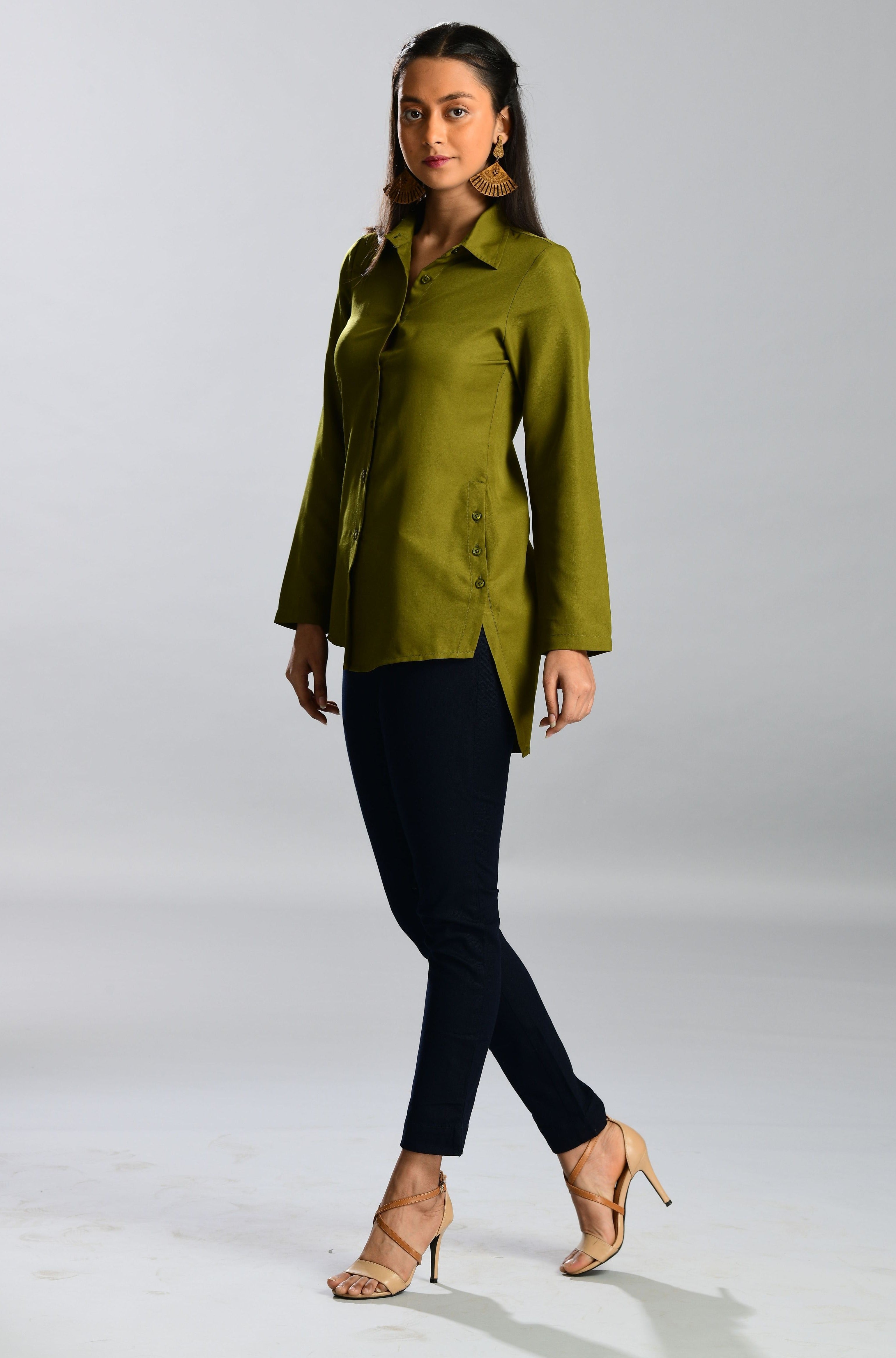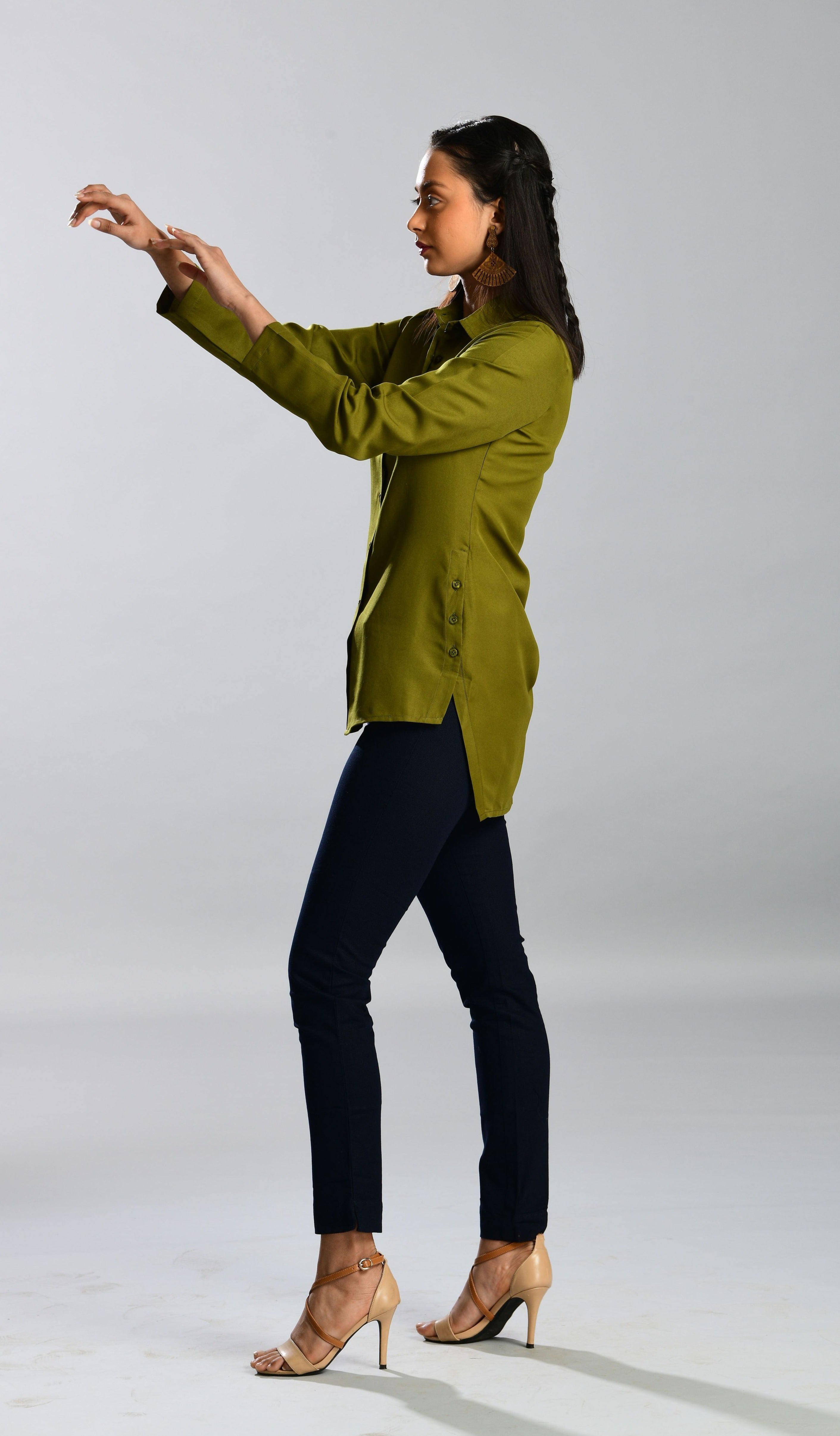 Olive is the color of the season. Pair it with perfect fit, premium comfort and smooth drape and you get this piece of chic fashion. The slight hint of shimmer on the fabric makes this shirt a perfect addition to your business casual collection. The beauty of this shirt is it's ability to go well with almost every bottom you have and its adaptability between casual to formal looks.