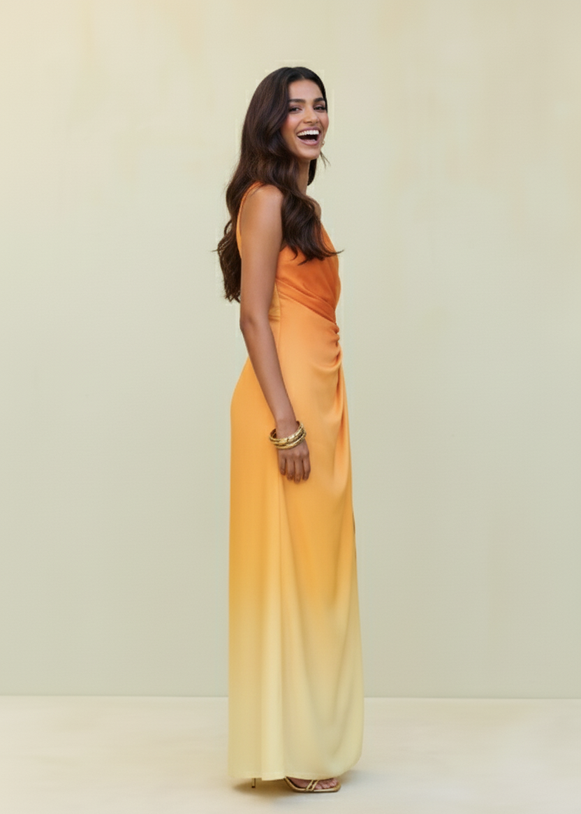 The Orange Ombre dress is an effortlessly elegant one-shoulder silhouette designed for the modern traveler. Featuring a flattering twist knot at the waist, a graceful side slit, and a stunning ombré gradient that fades from warm coral to soft lemon, this flowy maxi brings a touch of sunshine to every step. Its lightweight fabric drapes beautifully on the body, offering both comfort and sophistication. Perfect for resort getaways, evening strolls, or sunset dinners, this dress embodies effortless style and timeless charm. Gentle wash or dry clean recommended to maintain its color and drape.