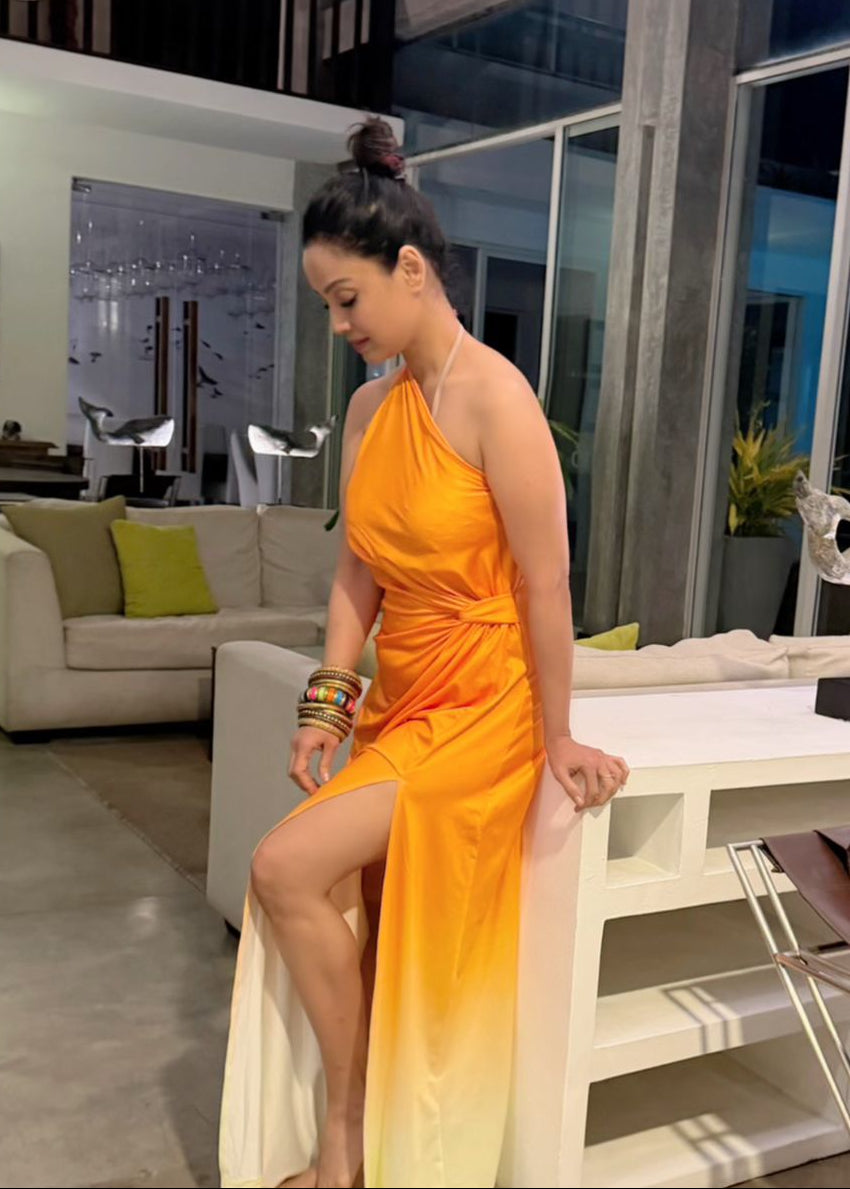 The Orange Ombre dress is an effortlessly elegant one-shoulder silhouette designed for the modern traveler. Featuring a flattering twist knot at the waist, a graceful side slit, and a stunning ombré gradient that fades from warm coral to soft lemon, this flowy maxi brings a touch of sunshine to every step. Its lightweight fabric drapes beautifully on the body, offering both comfort and sophistication. Perfect for resort getaways, evening strolls, or sunset dinners, this dress embodies effortless style and timeless charm. Gentle wash or dry clean recommended to maintain its color and drape.