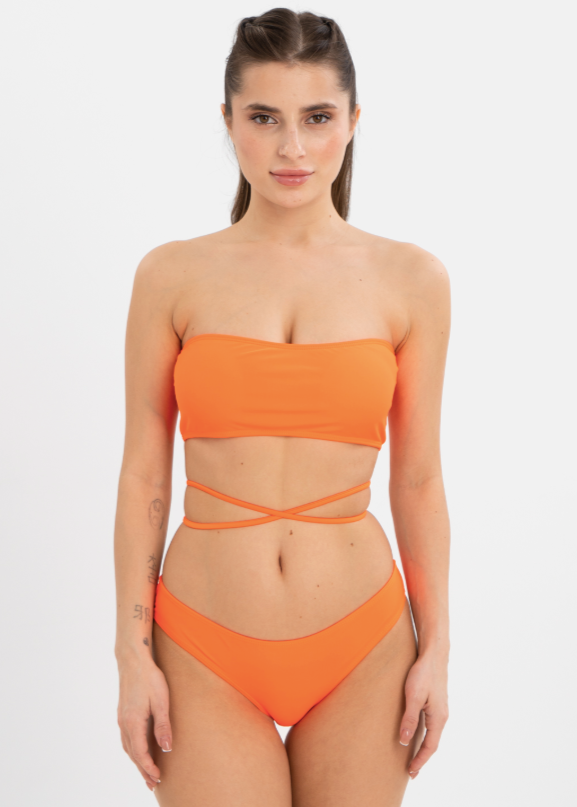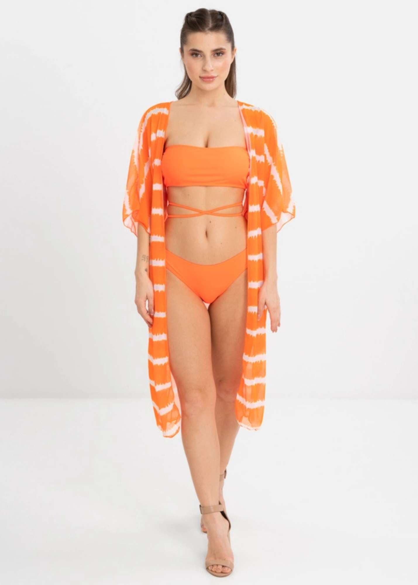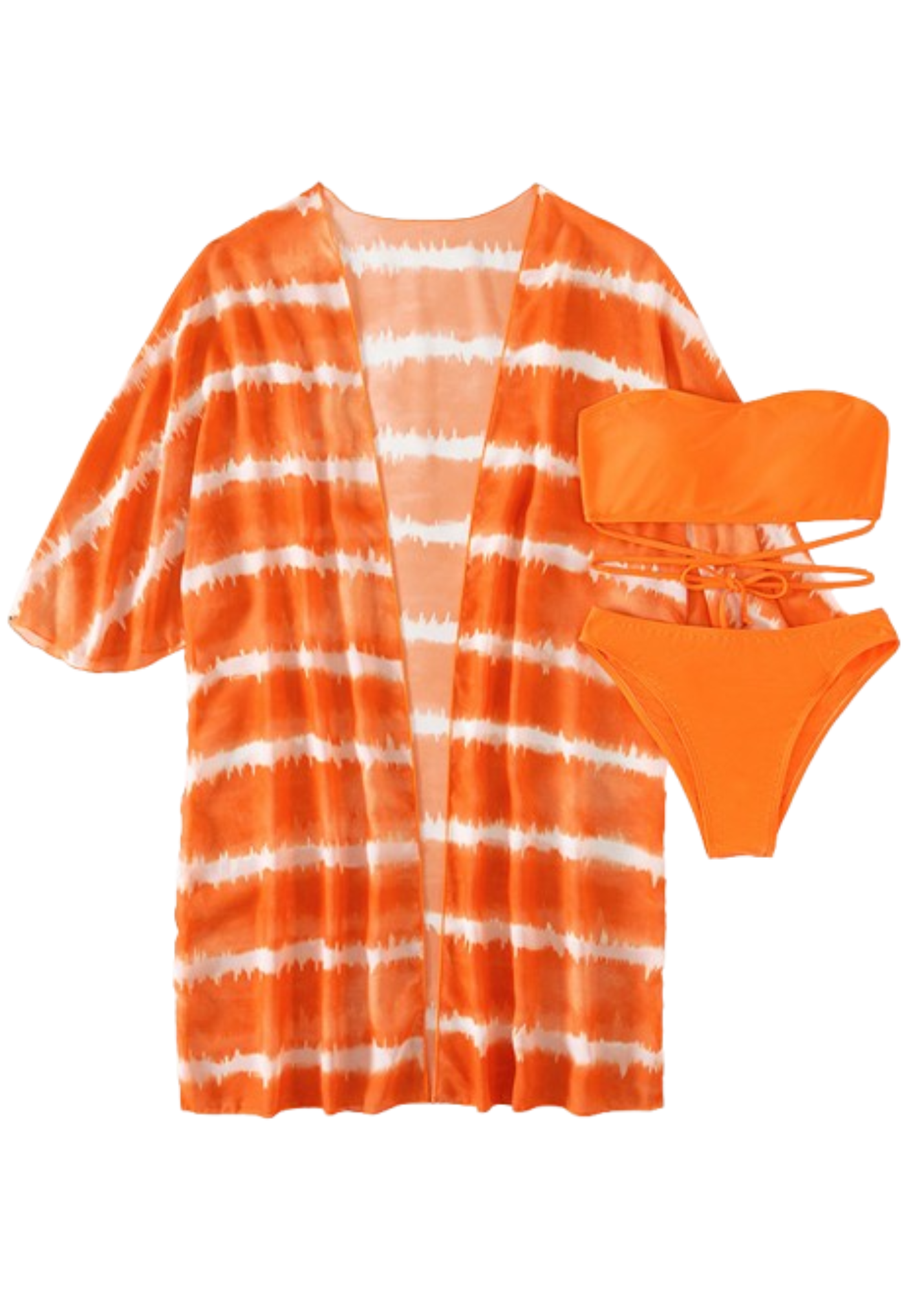 This Orange Tube 3-piece swimwear set features a bold tangerine bandeau top with removable padding, paired with a flattering high-waisted bottom and a flowing tie-dye kimono cover-up. The criss-cross wrap tie detail adds a stylish touch while accentuating the waist. Perfect for beach days or poolside lounging, this set blends effortless comfort with standout style.