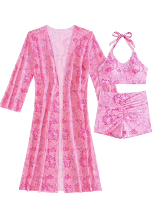 Turn heads at the beach or poolside with our Pink Swimwear with Shrug. This chic three-piece set includes a halter-neck bikini top, high-waisted ruched shorts, and a sheer, flowy shrug for the perfect blend of style and comfort. The vibrant pink floral pattern adds a playful yet sophisticated touch, while the sheer shrug offers an elegant, airy layer to enhance your look.
