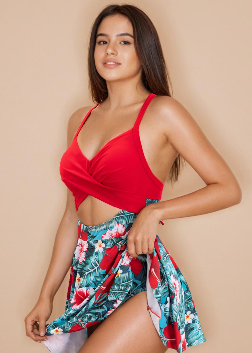 This 2-pieces Bikini combines bold style and functional comfort, featuring a flattering red twisted front that enhances the bust and a playful waist cutout for added flair. The tropical floral skirted bottom offers modest coverage, revealing a matching bikini underneath. It also has adjustable criss-cross straps at the back and a tie-up closure for a customisable, secure fit. Perfect for beach outings or poolside lounging, this Bikini offers a stylish yet practical look that boosts confidence while keeping you comfortable.