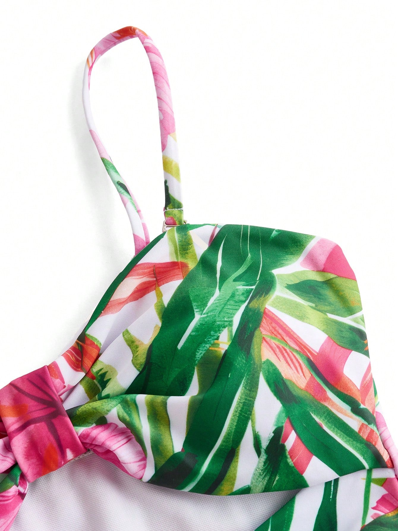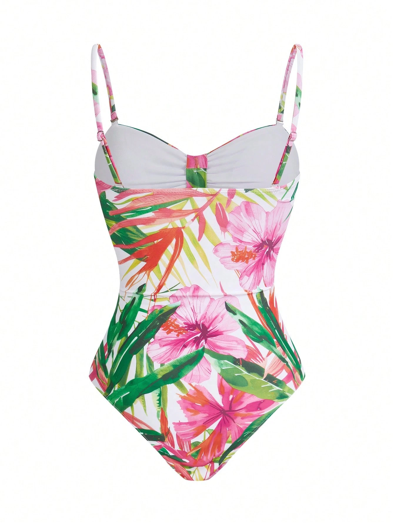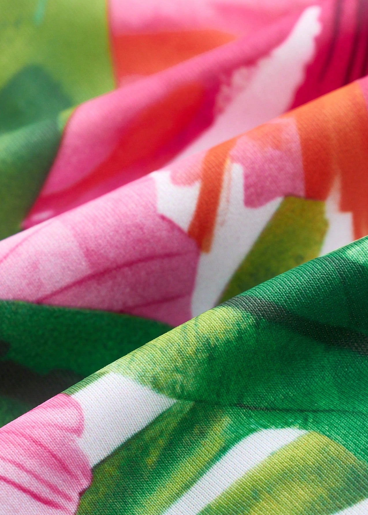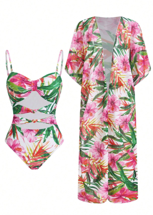 Designed with bold hibiscus florals and lush green leaves, this set brings the perfect blend of elegance and tropical vibes. The swimsuit’s flattering cutout design and bow detail add a stylish edge, while the lightweight kimono cover-up provides comfort and coverage for an effortless beach-to-bar transition. Ideal for vacations, pool parties, or tropical getaways, this coordinated set is the ultimate summer essential.