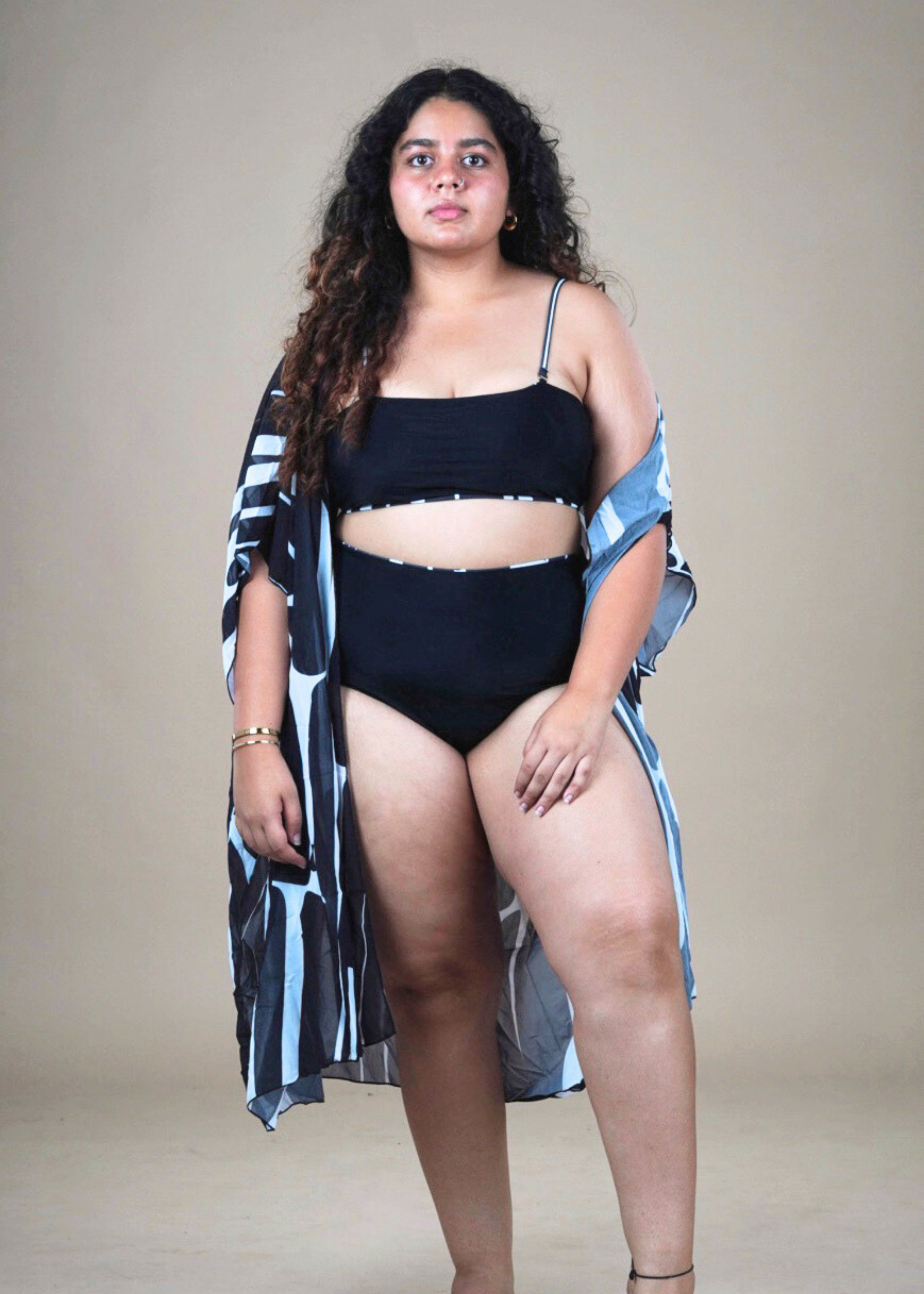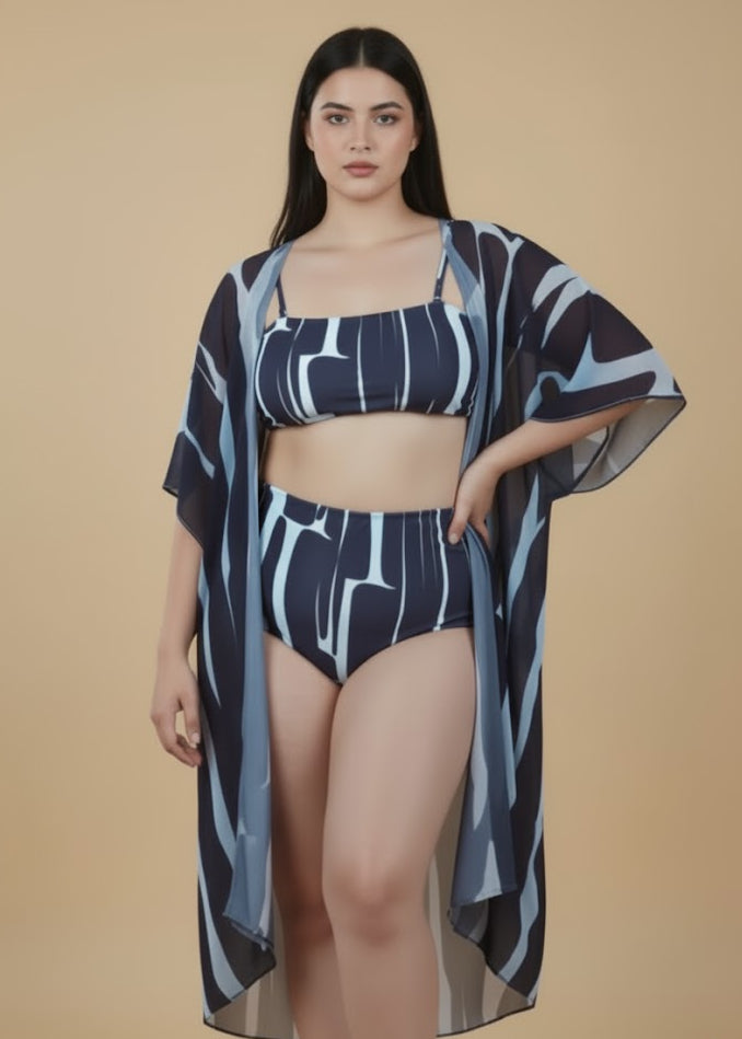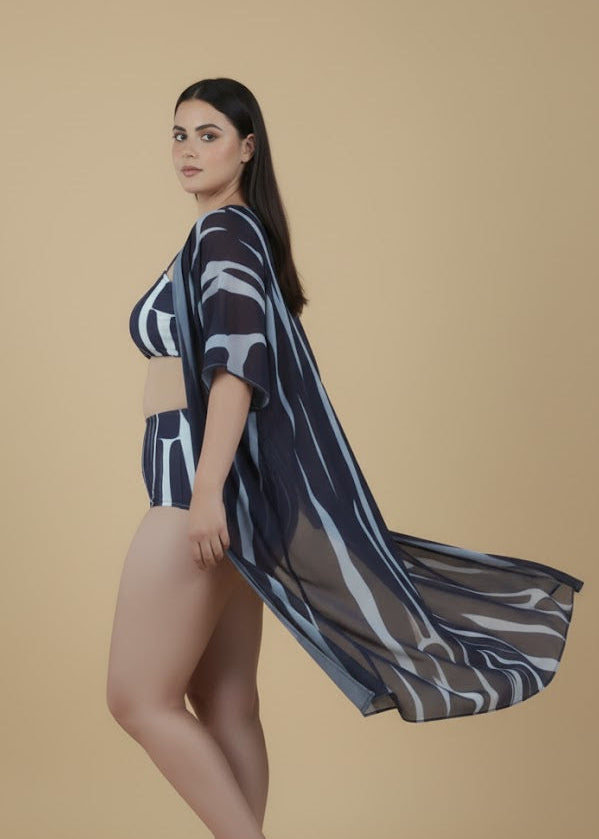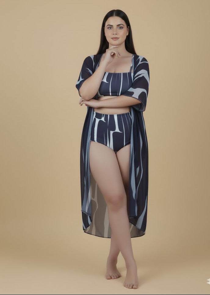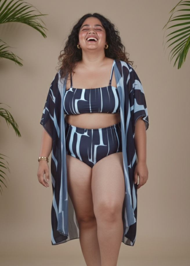 Waves by Shrijal: Turn the Tide, a stylish high-waisted bikini set accompanied by a matching coverup boasting a captivating black and white graphic print. This fashionable swimwear is designed to make a statement, allowing you to effortlessly turn heads at the beach or poolside. With its high-waisted bikini bottoms and coordinating coverup, this set offers both comfort and style. Embrace the Waves by Shrijal: Turn the Tide and make a splash with this chic and trendy swimwear set.
