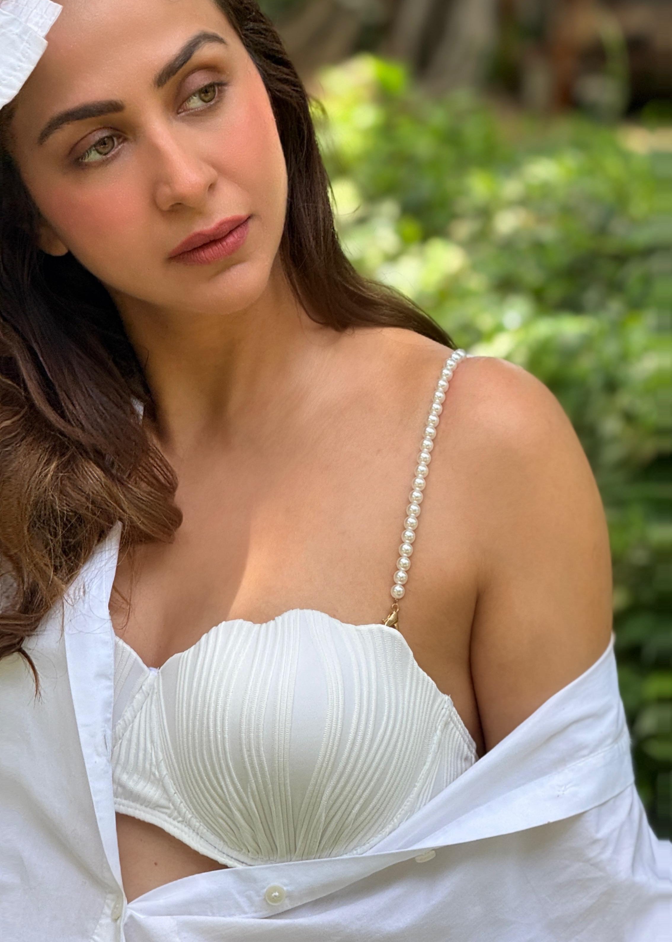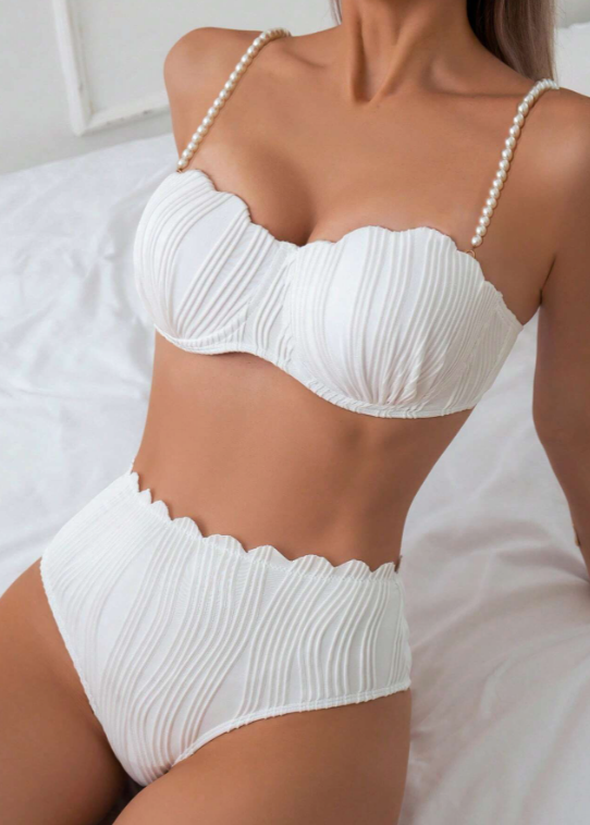 Elevate your beach look with this pearl-strap textured bikini set, featuring a scalloped balconette top for a flattering lift and a high-waisted bottom that cinches the waist. The pleated fabric and delicate pearl straps add a touch of elegance.